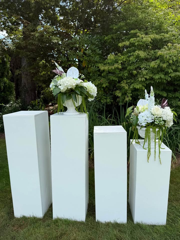 Our tallest display plinth at 42 inches. Creates commanding height for floral arrangements, ceremony aisle decor, and cake displays. The clean white finish complements any style from rustic to modern. Group with our 36-inch and 30-inch plinths for graduated visual impact.