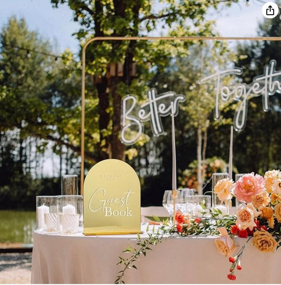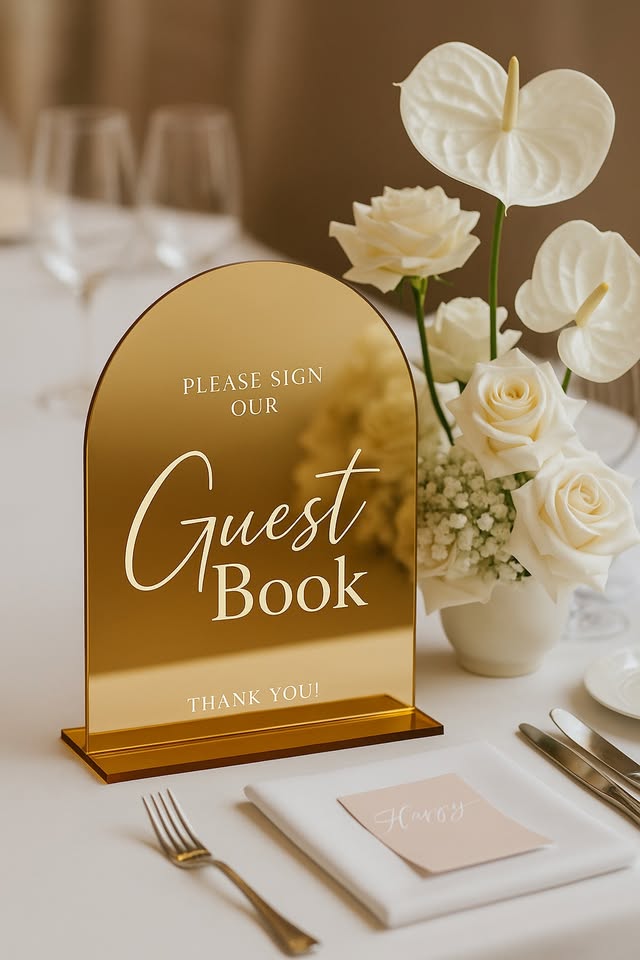 Elegant gold-finished acrylic arch sign reading 'Guestbook.' Coordinates with our table numbers and other acrylic signage for a unified aesthetic. Freestanding design pairs beautifully with our display plinths and card boxes.