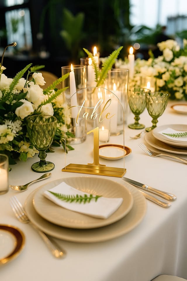 Table numbers, card boxes, parasols, sign stands, lanterns, and fringe umbrellas add finishing touches that tie your styling together. These small details are often what guests notice and remember.