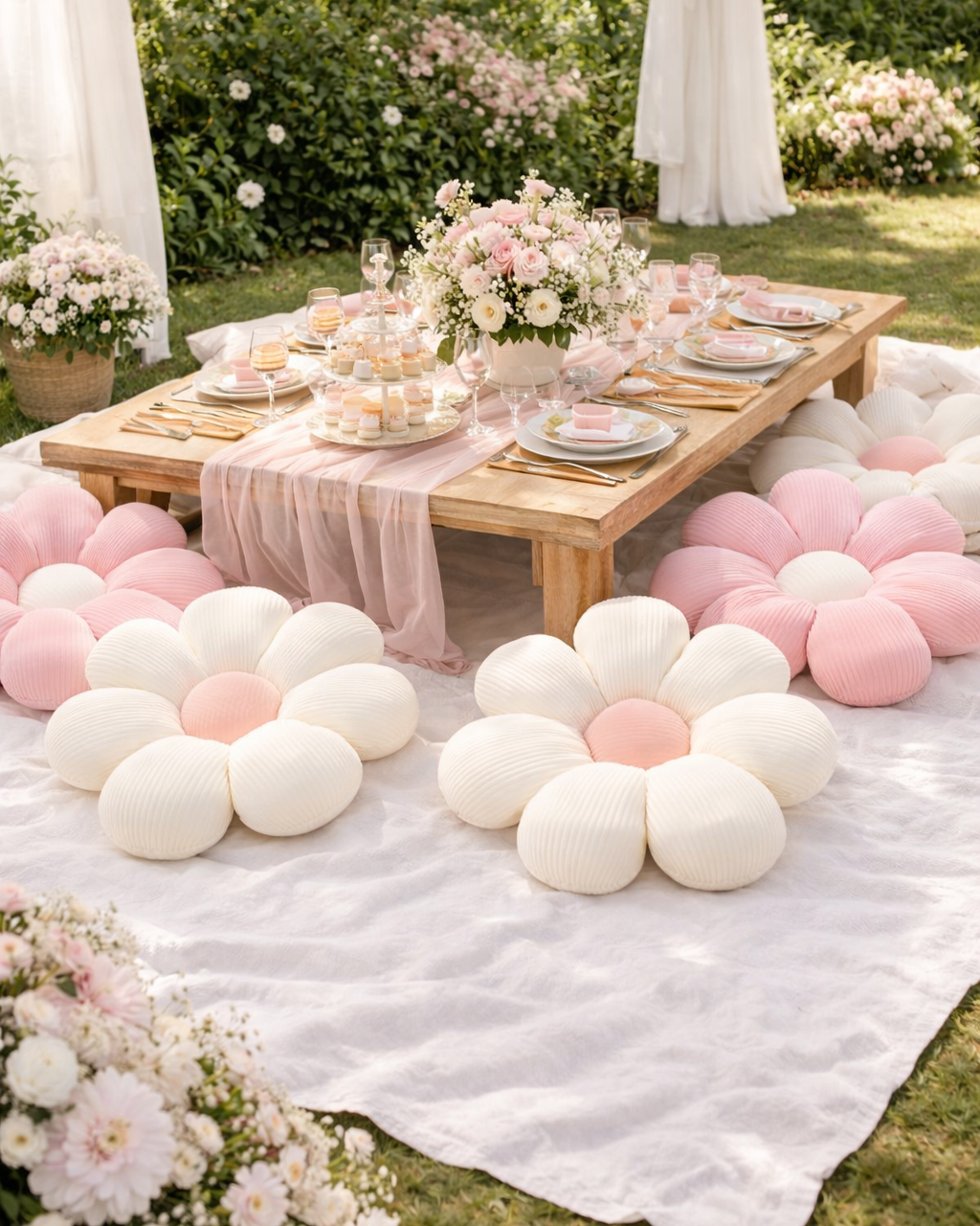 Set of two decorative pillows featuring pink and white floral designs. Add personality to lounge areas, ceremony seating, or styled vignettes. The floral pattern brings a romantic, garden-party feel to any space.