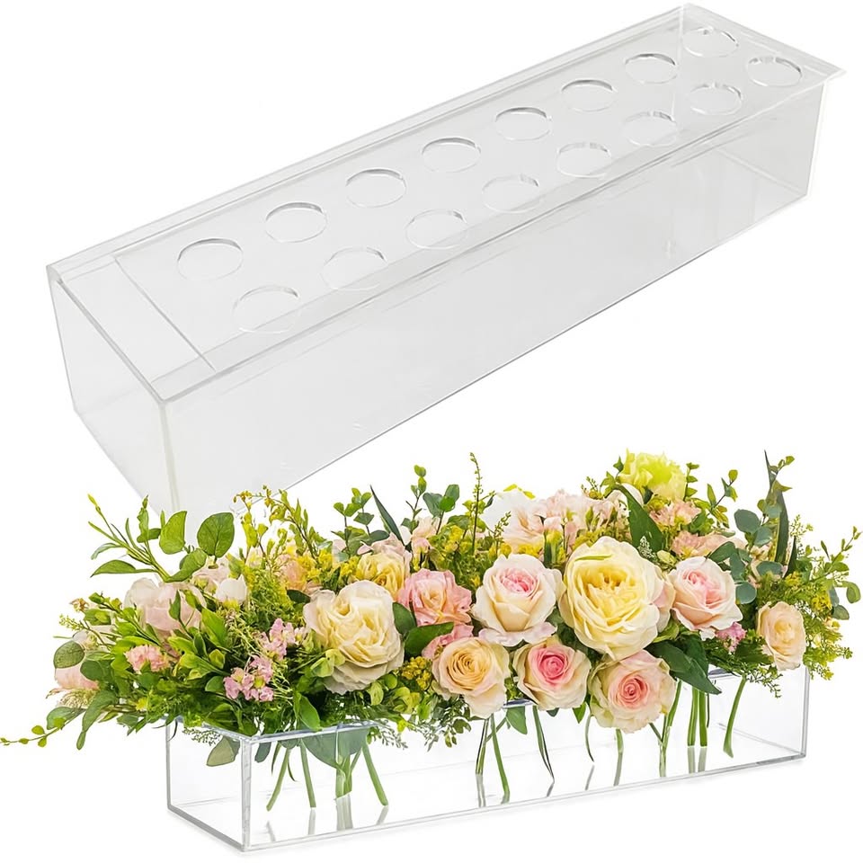 Large rectangular acrylic vase designed for substantial floral or greenery arrangements. The clear acrylic creates a modern, clean aesthetic and makes stems and water visible for an organic, deconstructed look. A versatile standalone centerpiece for guest tables.
