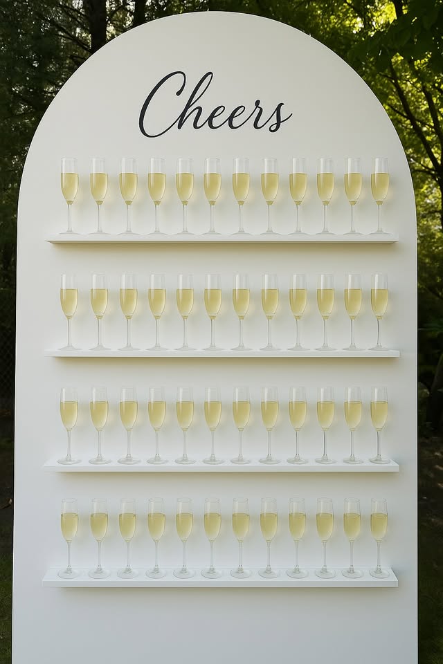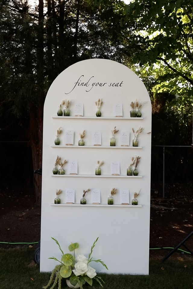 Versatile 8-foot white display wall featuring 4 built-in shelves. Perfect for dessert tables, escort card displays, welcome areas, and favour stations. The clean, modern design works with any colour palette and photographs beautifully. Freestanding construction compatible with all venue types.